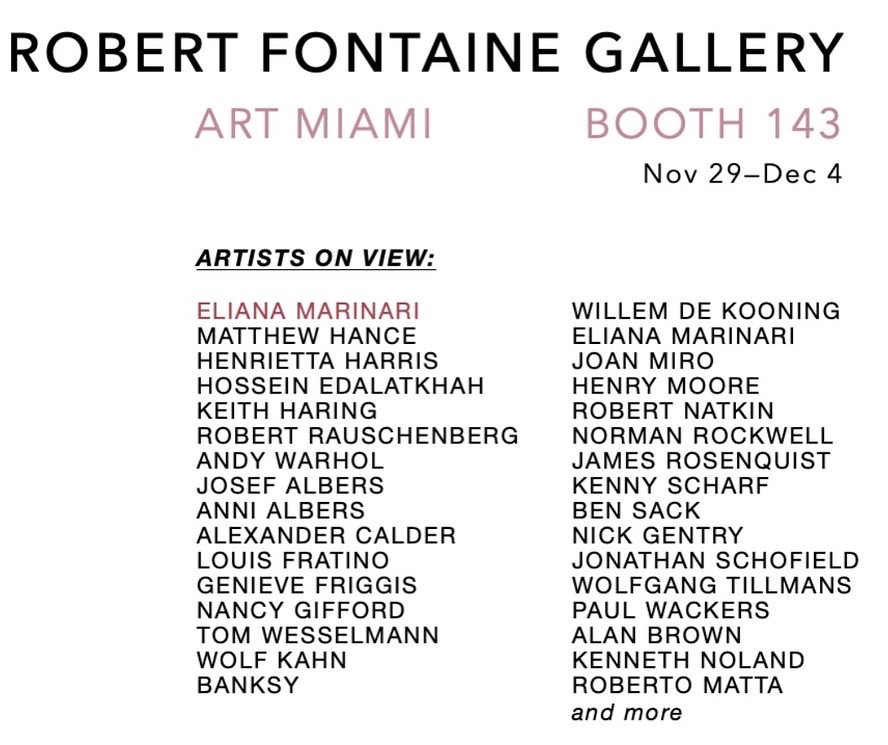 EXHIBITING @ ART MIAMI FAIR / Robert Fontaine Gallery / Booth 143/Nov 29-Dec 4 2022 Share: Click to share on Facebook (Opens in new window) Facebook Click to share on X (Opens in new window) X Click to share on WhatsApp (Opens in new window) WhatsApp Click to share on Pinterest (Opens in new window) Pinterest Posted on December 5, 2022December 5, 2022 Posted in Art