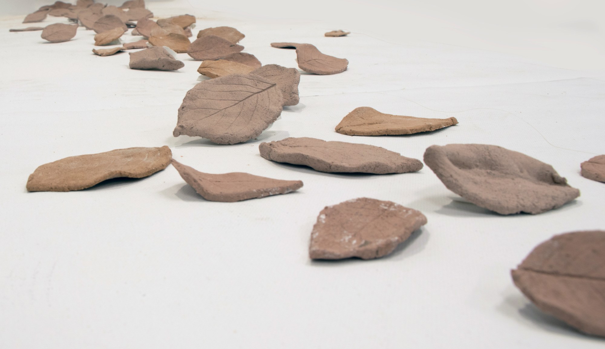 Imprints of Present, Traces of Arve. 2024. Detail. Handmade clay leaves on canvas.