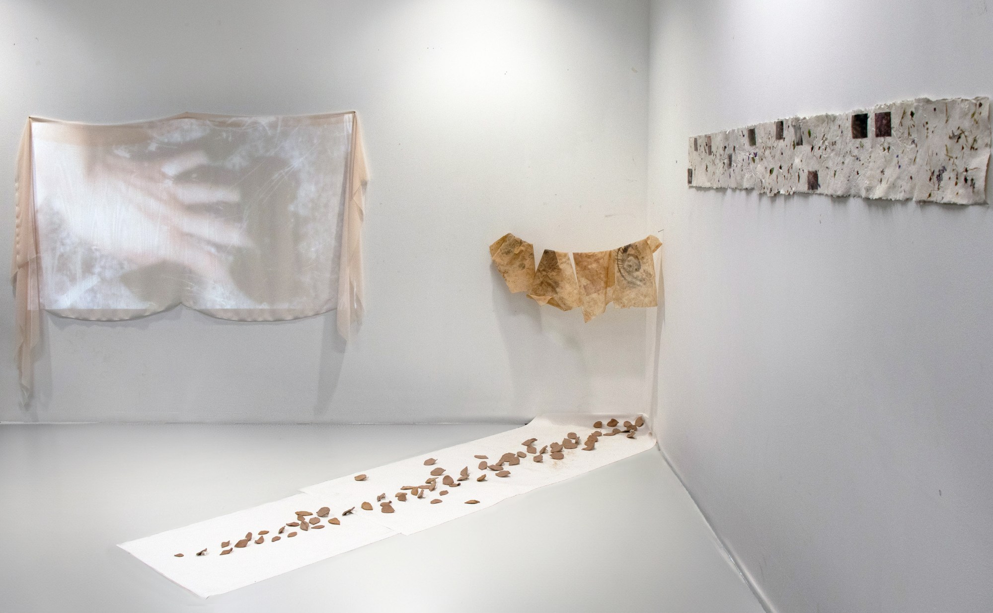 Imprints of Present, Traces of Arve. 2024. Mixed media installation. Handmade clay on fabric lithographs. 35×95 cm. Handmade clay leaves on canvas. 76×287 cm. Film transparencies hand stitched with hair on handmade paper with collected leaves, flowers, plants and hair. 21×260 cm. Projected film transparency on fabric. 107×150 cm.