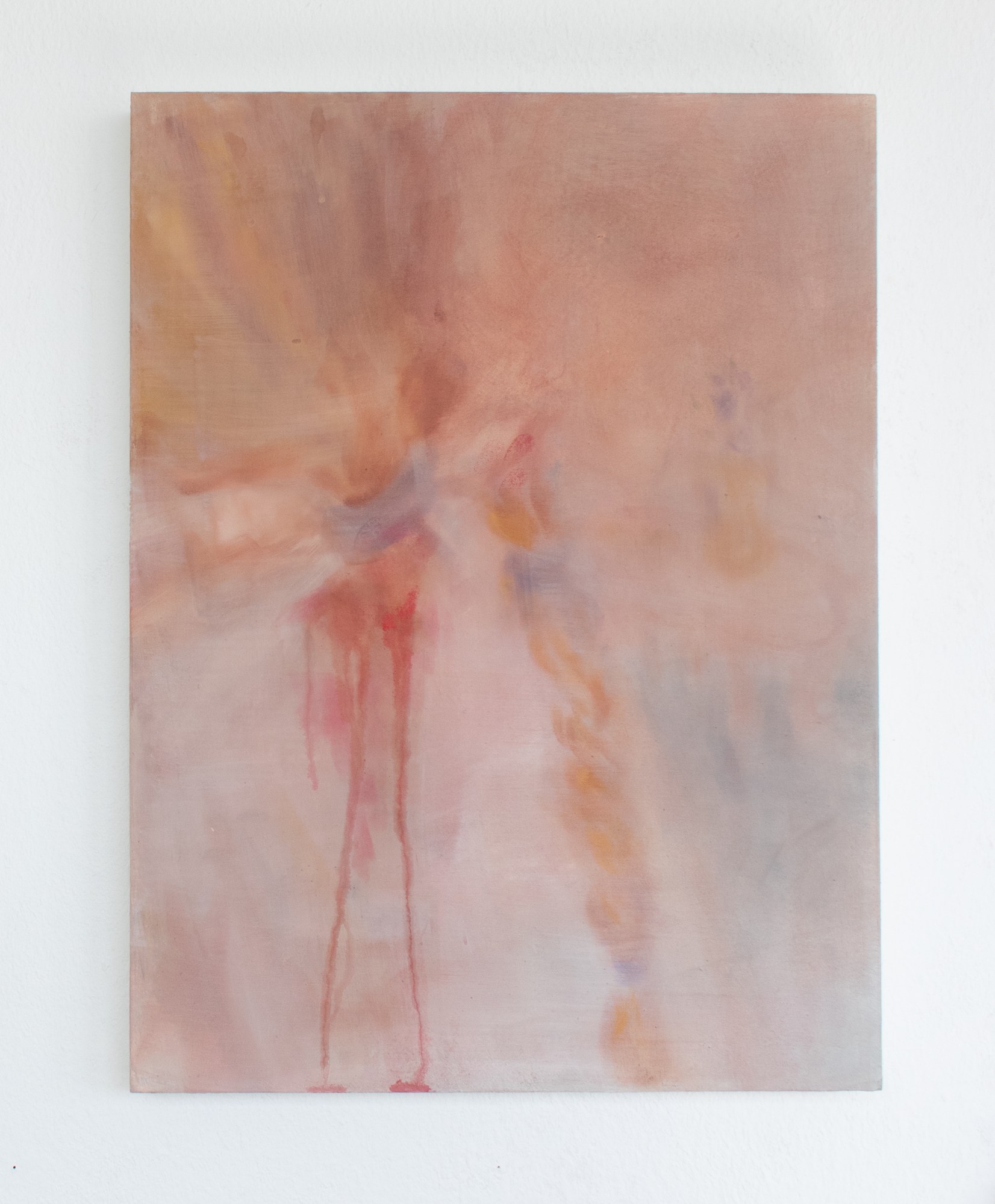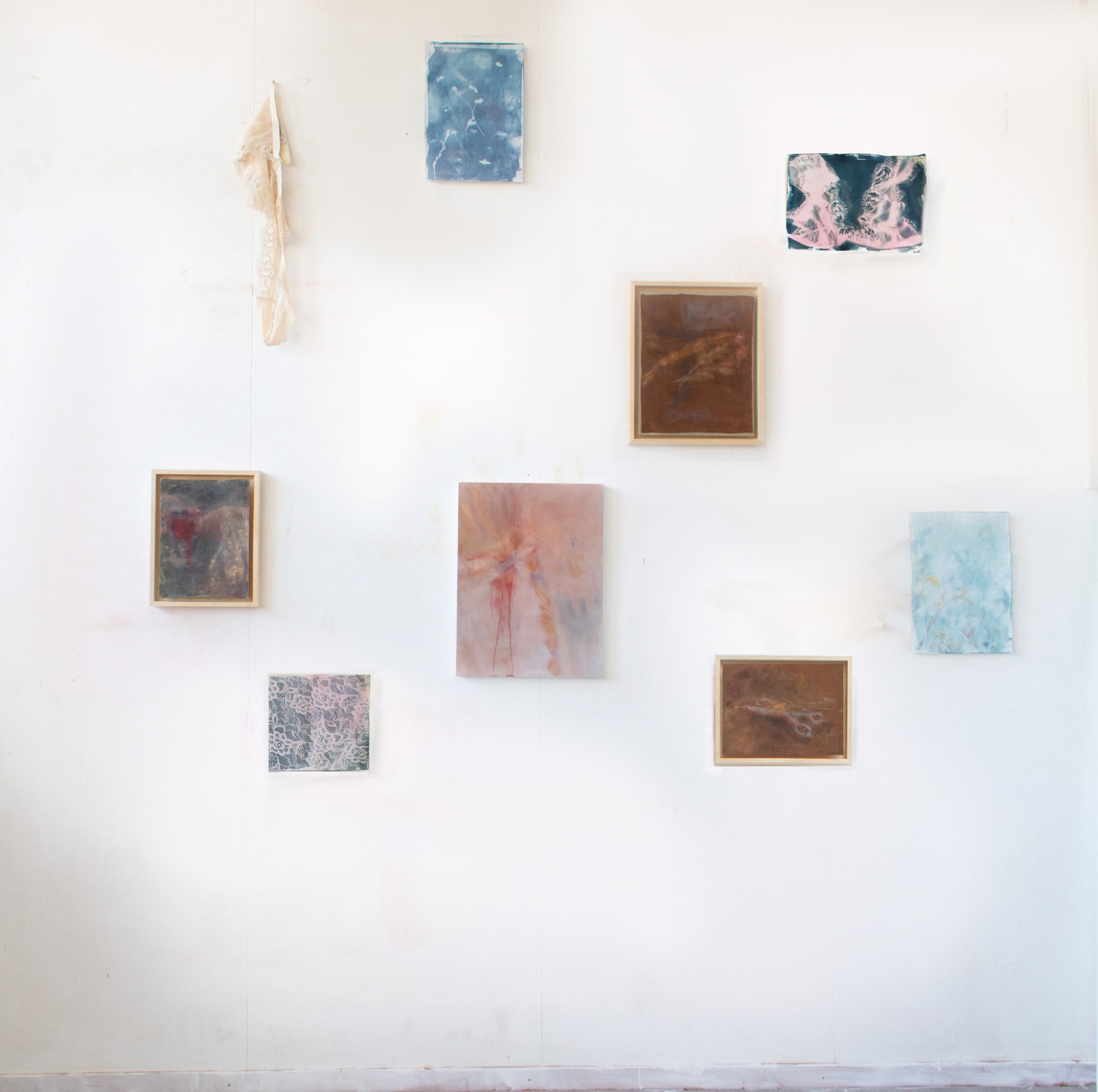 In The diary the artist is deeply concerned with cultural forms of ceremony, archetypes, femininity, the visceral body, and how all this links to a latent Christian symbolism. She creates a group of works using multiplicity and layering, to render visible to consciousness unconscious phenomena. In this mixed media installation, the garment functions as a ‘shocking’ element, turning the paintings into a form of ‘prop’. Its indexical image and the other cyanotypes have a ghostly appearance, as if they almost produced themselves.